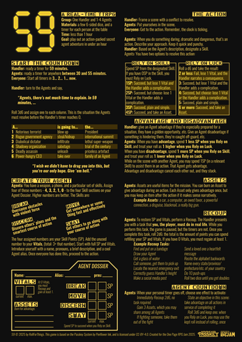59 is a necessarily short, one-shot game about elite agents racing to stop a deadly threat. Agents have the choice to automatically succeed in something they're skilled at, for a price, to keep the action moving. And you really do need to keep the action moving: you only have 59 minutes of real time to set up the threat, create your agents, and the save day.